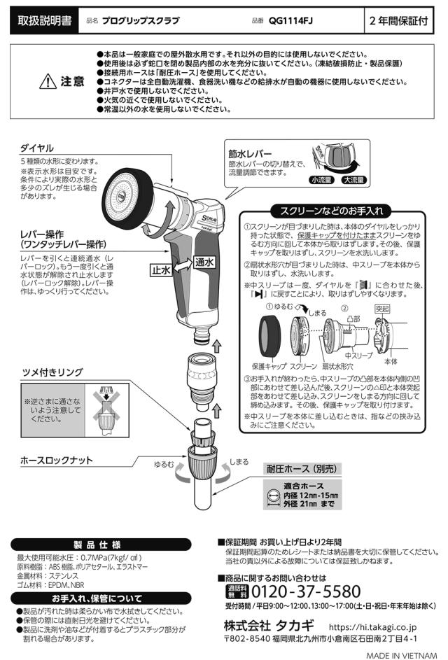散水ノズル ホースノズル ホースリール 洗車 清掃 掃除 5水形 シャワー ジョウロ フラット 勢い 広範囲 タカギ takagi コネクター付き 公式 2年間保証 QG1114FJ プログリップスクラブ(FJ) ホワイト ホース内径12-15mm/外径21mm