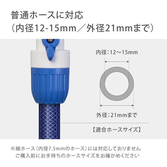 普通ホース(内径12-15mm/外径21mmまで)に対応しています。