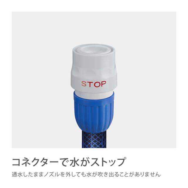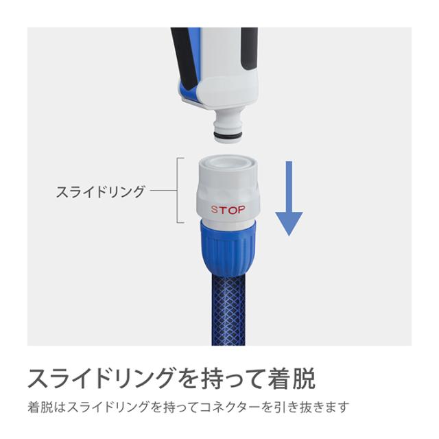 ホースやノズルの取り外しがワンタッチになる便利なアイテムです。通水したまま取り外しても水が噴き出さないストップ機能がついています。