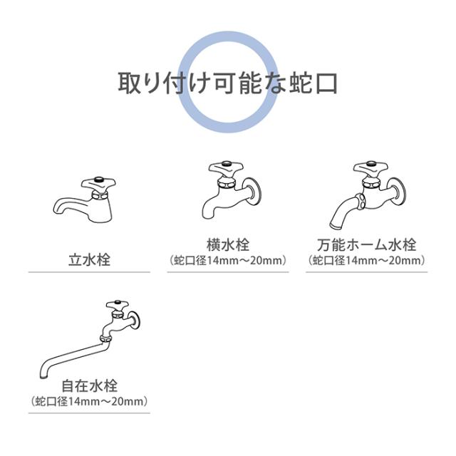 取付られる蛇口は立水栓、横水栓(蛇口径14-20mm)、万能ホーム水栓、自在水栓(蛇口径14-20mm)です。