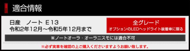 | 適合 | 日産 ノート E13 令和2年 12月〜令和5年12月 全グレード[オプションのLEDヘッドライト装着車のみ適合] |