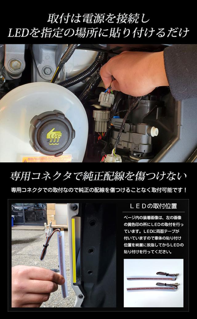 | 商品詳細 | バンパーサイドの空気口を幻想的に光らせることができるLEDカスタム商品が登場! ホワイトorブルーのインパクトのある専用LEDで、他車と差別化できる人気のカスタマイズです。 拡散性のあるLEDを使用しているため、該当箇所がきれいに光ります。 取付位置も予め決めてあり、写真付きの取扱説明書もございますので比較的簡単に取り付けが可能です。 LED本体の裏側には両面テープ付き。電源を取ってきてLED配線と接続させるだけでOKです! 専用カプラー付き配線なので純正配線を傷つけないのもポイントです。 |
