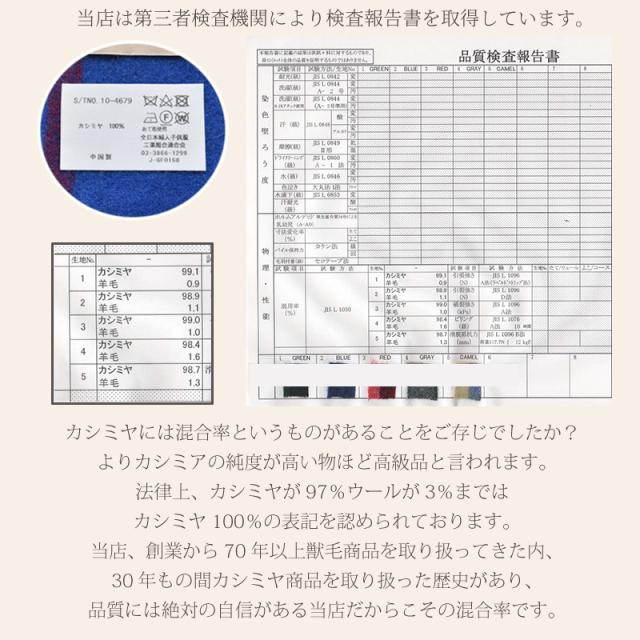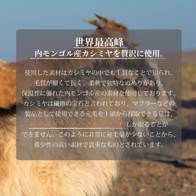 | その他詳細 | この製品はカシミヤ山羊の毛を100%原料として使用しています。 カシミヤは寒暑の厳しい山岳地帯に生息するカシミヤ山羊の産毛から生まれます。 その繊細で柔軟性に富んだ独特なぬめりのある手触りを生かすよう縫製仕上げに繊細な注意をはらい、完成された最高級品です。 |