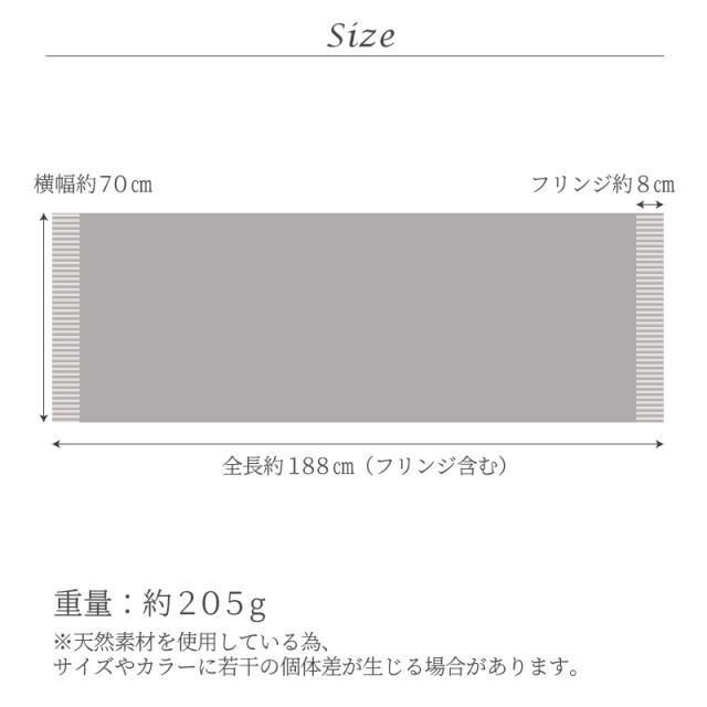 | スペック | 【サイズ】全長約188cm×横幅約70cm(フリンジ含む) 【重さ】205g |