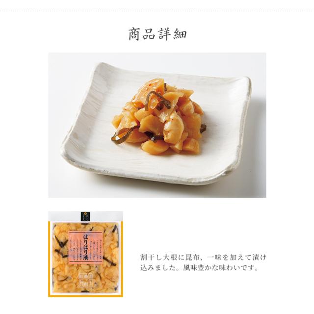 | 《はりはり漬 90g》 昆布と生姜、一味を加えて漬け込んだ割り干し大根。 温かいごはんに、お弁当に、 ほんのり甘辛い風味は、お子様からご年配の方まで幅広く好評いただいています。 ※ご自宅お届けの場合、ご注文いただいた商品を包装紙または専用ビニールで一括包装してお届けいたします。 (包装紙・ビニールをお選びいただくことはできかねますのであらかじめご了承ください。) ※手提げ袋は有料です。 ページ内の「手提げ袋について」のバナーから商品と一緒にお買い求めください。 ※手提げ袋は有料です。 ページ内の「手提げ袋は購入はこちら」から商品と一緒にお買い求めください。 |
