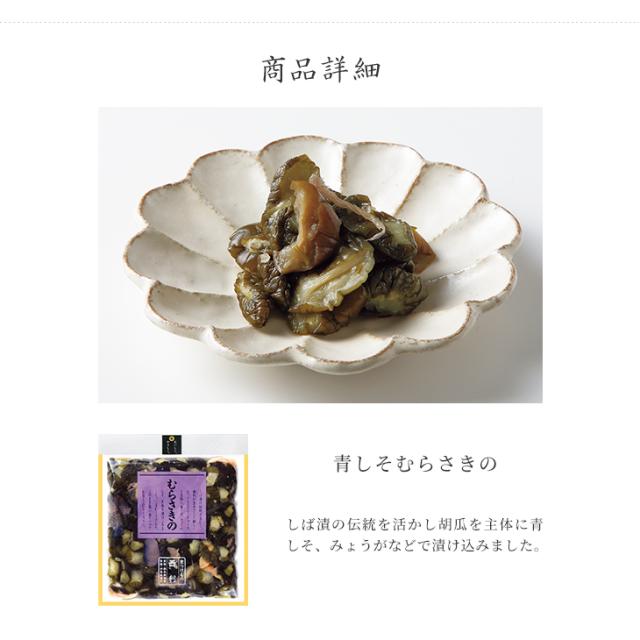 | 《青しそむらさきの 100g》 しば漬の伝統を活かし、胡瓜を主体に青しそ、みょうがなどを西利独自の漬け床で漬けあげました。 ごはんにお弁当、ビールのおつまみに、青しその爽やかな風味と歯切れの良さをお楽しみください。 ※ご自宅お届けの場合、ご注文いただいた商品を包装紙または専用ビニールで一括包装してお届けいたします。 (包装紙・ビニールをお選びいただくことはできかねますのであらかじめご了承ください。) ※手提げ袋が有料になりました。 ページ内の「手提げ袋は購入はこちら」から商品と一緒にお買い求めください。 ※手提げ袋は有料です。 ページ内の「手提げ袋は購入はこちら」から商品と一緒にお買い求めください。 |