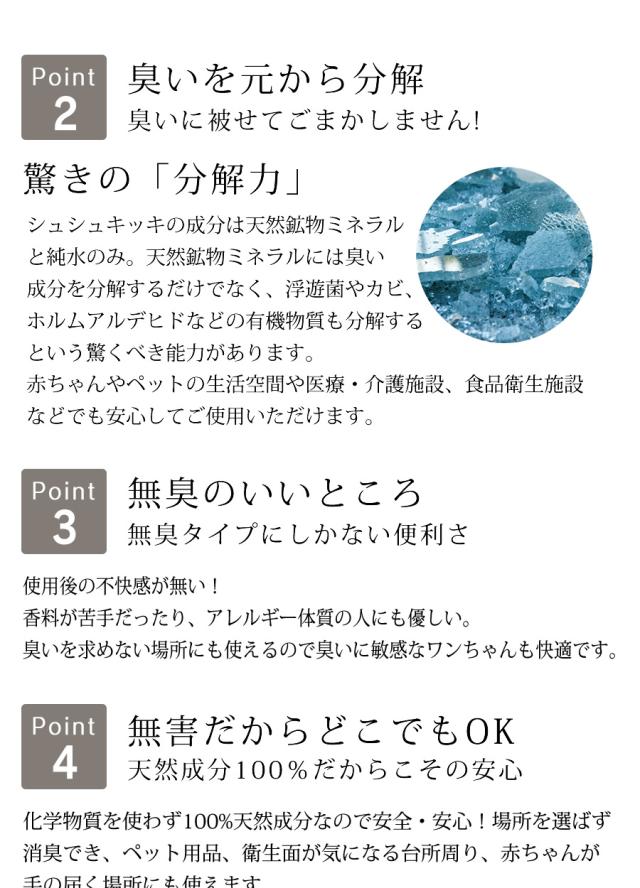 化学物質を使わず100%天然成分(鉱物ミネラル、純水のみ)なので、使う場所を選びません。