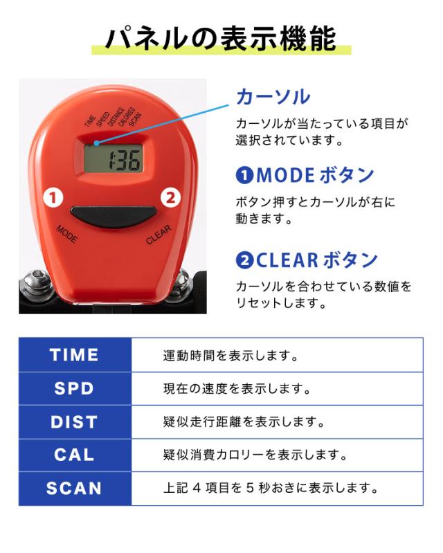 ・時間、速度、距離、消費カロリーが見れるパネル付き
