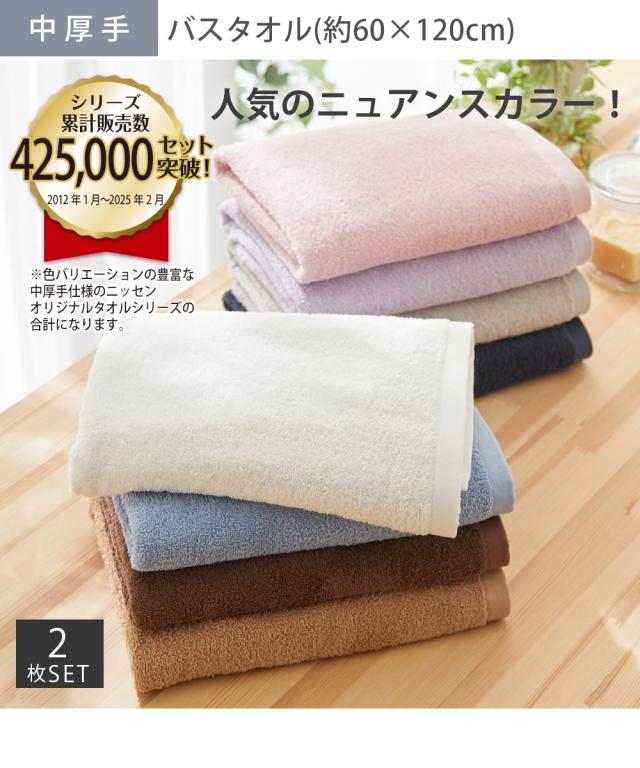 バスタオル 肌ざわりいい 中厚手 同色2枚セット デイリーシリーズ キャラメルベージュ〜ラベンダー 約60×120cm ニッセン nissen