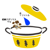 アルミ以外の耐熱容器(瀬戸物・土瓶・耐熱ガラスなど)に乾燥アガリクス15gと水1リットルを入れ沸騰したら、弱火で20分程煮出します。 煮出したエキスは、温かいままお飲みいただくか、容器に入れて冷蔵庫で保存し、できるだけ早めにお飲みください。 | ![]() |