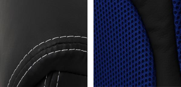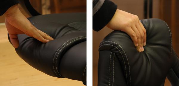 | お手入れしやすい張地 合成皮革を使用しており、耐水性に優れ、汚れてもサッと拭けるのでお手入れが楽です。 | 通気性のよいメッシュ 背面と頭部は一部メッシュ素材になっており通気性があるので、夏でも快適にお使い頂けます。 |