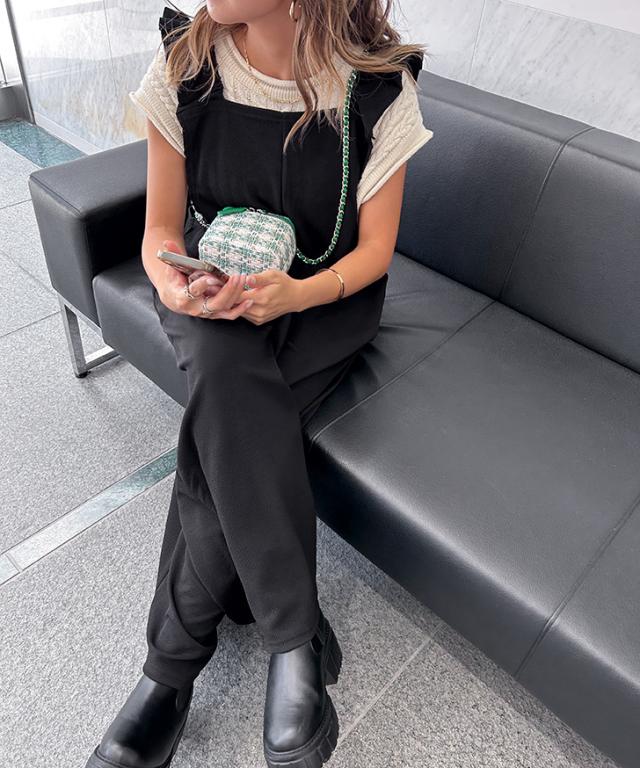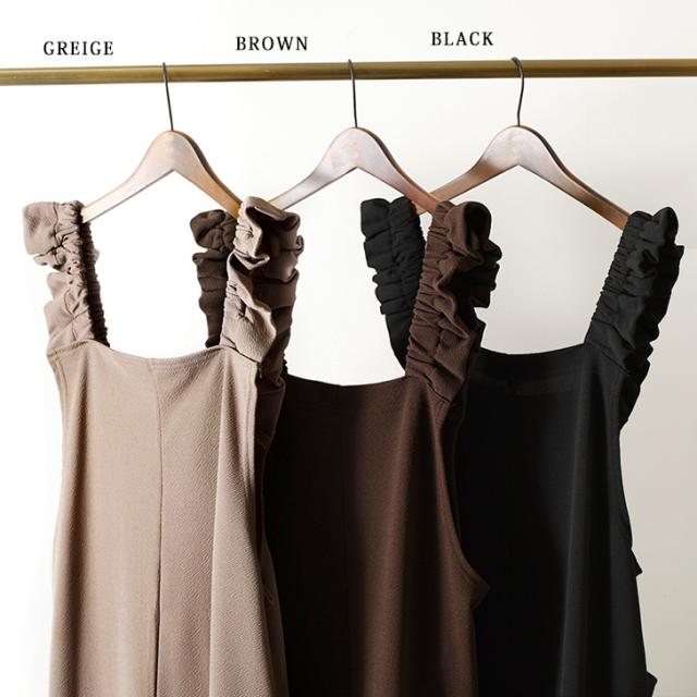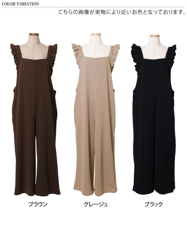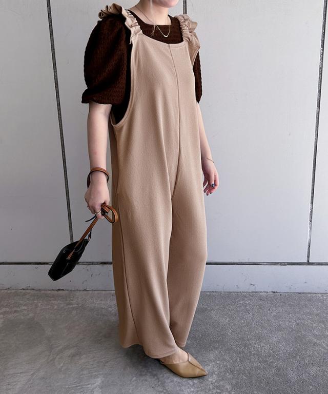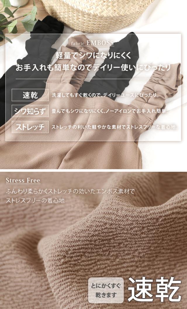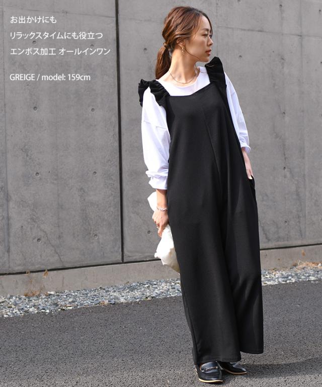 新作 オールインワン レディース サロペット ワイドパンツ ロング丈 ゆったり カジュアル エンボス フリル ギャザー リラックス ラフ