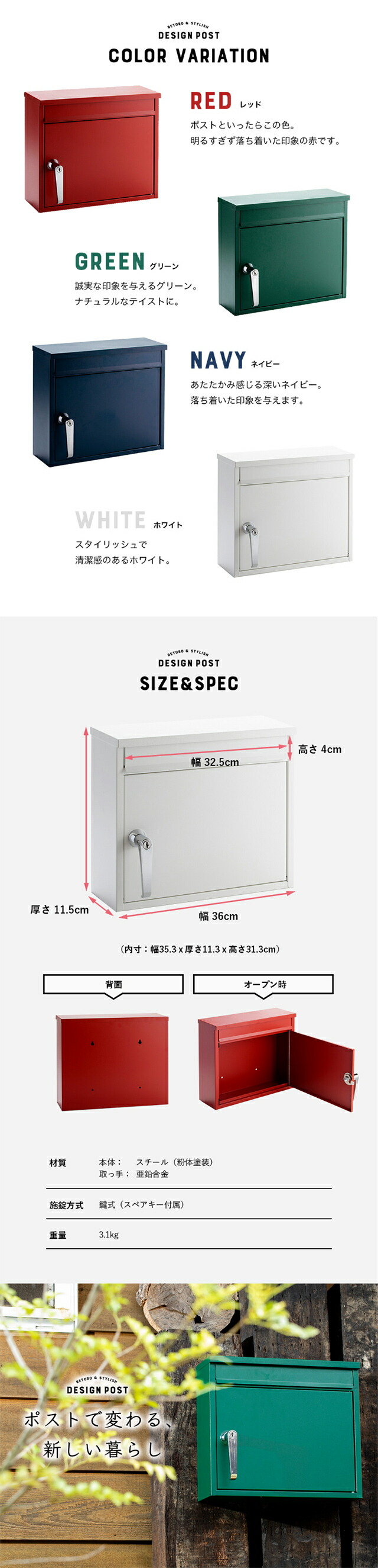 ポスト 壁掛け 鍵付き PPRD-36 ポスト 宅配ボックス 郵便ポスト 壁掛けポスト 北欧 北欧風 郵便受け 壁付け メールボックス レトロ カギ付 セキュリティ コンパクト スタイリッシュ スペアキー 鍵付きポスト オシャレ おしゃれ