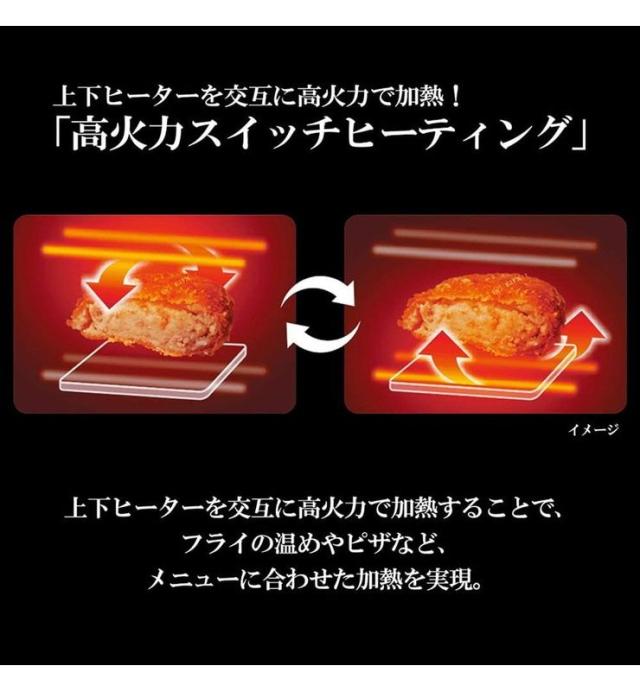 上下ヒーターを交互に高火力で加熱することで、フライの温めやピザなど、メニューにあわせた加熱を実現。