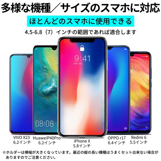 4.5-6.8(7)インチの範囲であれば適合します (iPhone X、HuaweiP40Pro、OPPO r17、Redmi 6、VIVO X23) ※ホルダーは横幅がやや広めです。最近の縦の長い機種はうまくセット出来ない場合がありますのでご注意ください。 |