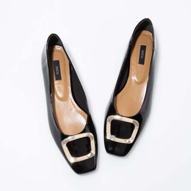 メタルモチーフがポイントのパンプス。フラットソールで、歩きやすさ◎エナメル調の素材で高級感をプラスしてくれます。落ち着いたカラー展開で、これからの季節にぴったり。通勤にもおすすめなアイテムです。