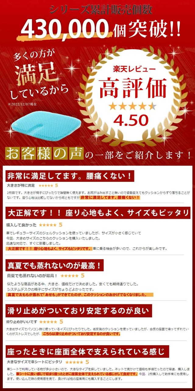 - 半信半疑で使って見ましたが、腰の負担が軽減されたように感じます。車のシートに敷いて使っています。