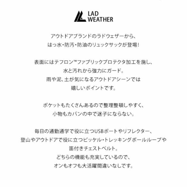ラドウェザー LAD WEATHER テフロン加工はっ水・防汚。大容量のアウトドアリュック