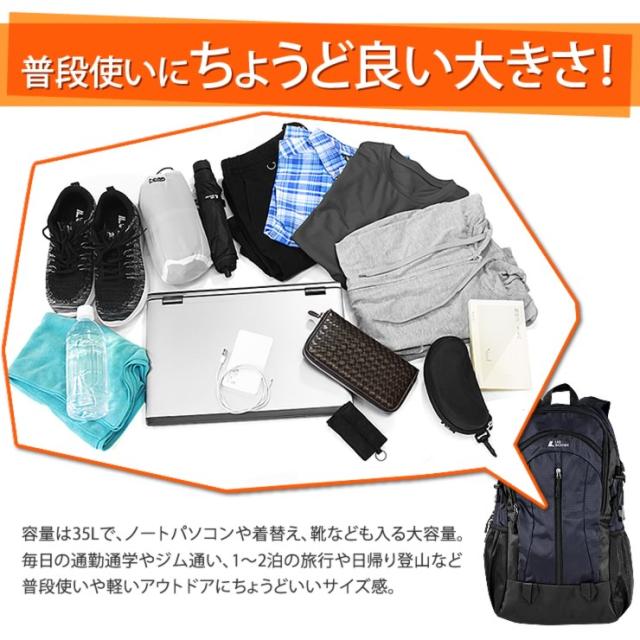 容量は35Lで、ノートパソコンや着替え、靴なども入る大容量。
