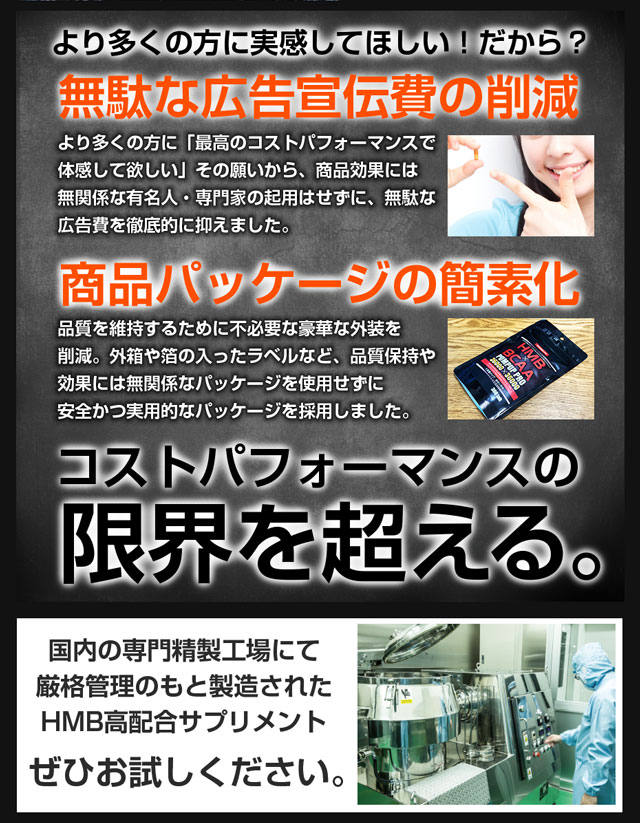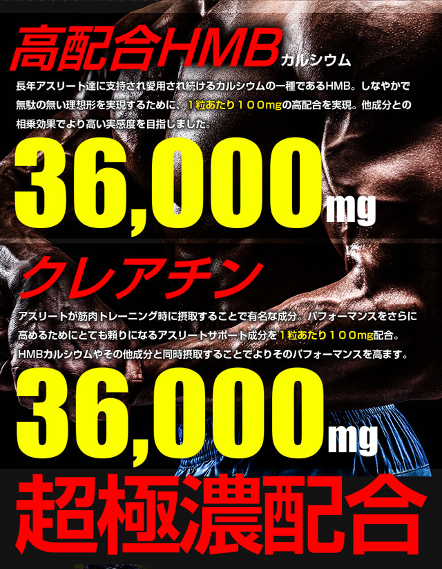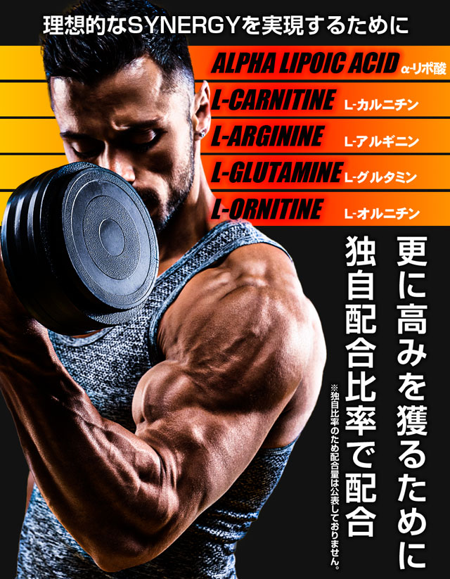 HMBカルシウム、クレアチン、L-カルニチンフマル酸塩、α-リポ酸、L-オルニチン塩酸塩 / セルロース、ステアリン酸カルシウム、微粒酸化ケイ素、L-グルタミン、L-アルギニン
