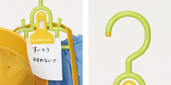 | メモをはさめるクリップ付 備忘録などのメモやプリントをはさめるクリップが付いており、持って行くのに必要な物をメモに書いておくことができます。 | スベリ止めキャップ付 ハンガー先には、ちょい置きできるスベリ止めキャップが付いているので、安定して掛けることができます。 |