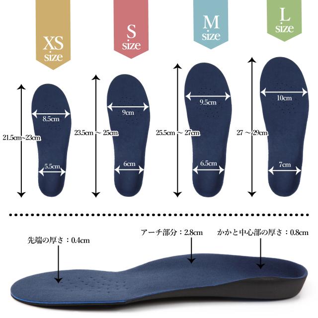 | サイズ | 【サイズ】XS:21.5〜23cm S:23.5〜25cm M:25.5〜27cm L:27.5〜29cm (※つま先部で約0.4cm、かかと中心部で約0.8cmの厚みがあります。ジャストサイズの靴、紐で調節のできない靴でのご使用は、窮屈になる場合がありますのでご注意ください) 【サイズ調整可能】ご家庭にあるハサミで簡単にカットでき、お持ちの靴に合わせてサイズの微調整が可能です。(※靴のサイズは各メーカーごとに異なりますので、少し大きめに切り、一度靴の上に敷いて微調整することをおすすめします) |