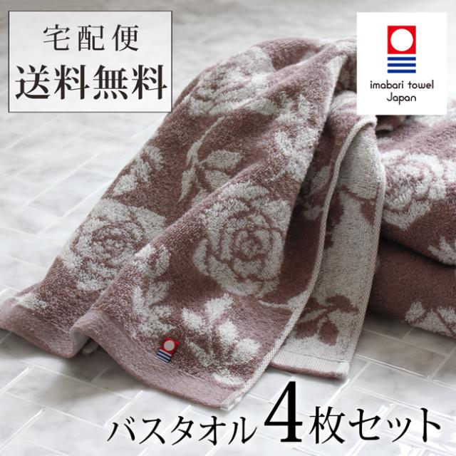 バスタオル まとめ買い 4枚セット 今治 お歳暮 【送料無料】 おしゃれ かわいい 今治タオル ギフト 上品 ふんわり バラ柄 ビターローズ やさしい暮らし 花柄 大人 きれい 茶色 ブラウン 日本製