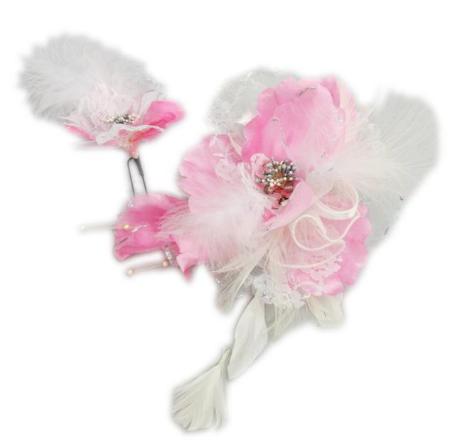 髪飾り 髪かざり コサージュ 2点セット ピンク可憐花レース羽根 振袖 成人式 卒業式 袴 着物