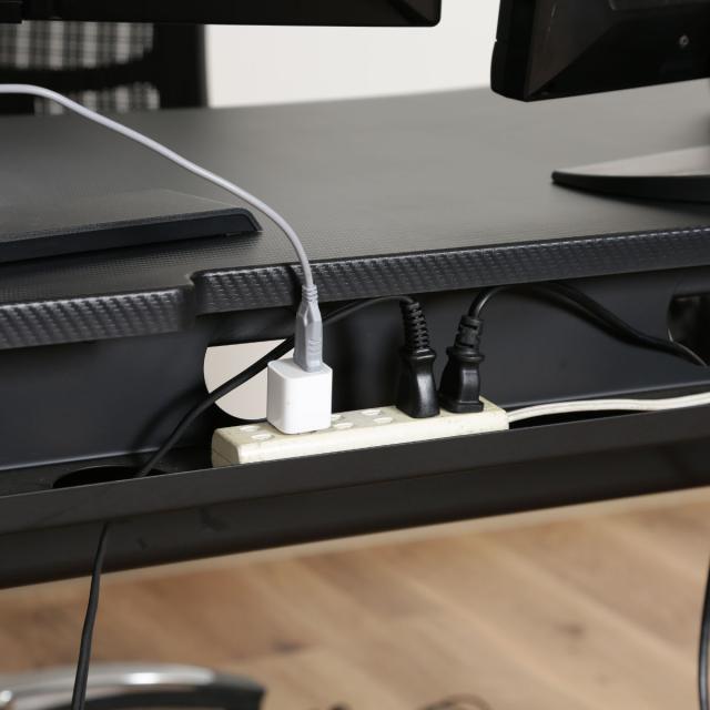 デスクの奥にタップを収納できるスペースが確保されているので、配線がスッキリりと片付きます。