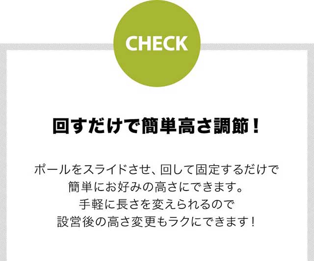 - 商品が届き、その週末にさっそく使用してみました。 初めてスライド式のポールを使ってみました とても使いやすく簡単に高さの調整が出来るのでとてもよかったです 買って正解でした