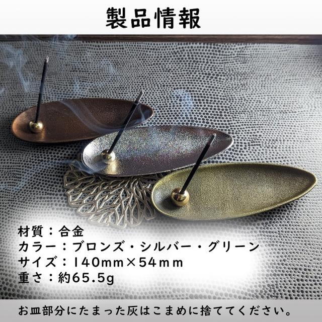 | 主な仕様 | ※本商品はショートタイプのお香に対応しております。 (※)お皿部分にたまった灰はこまめに捨ててください。 ●材質 : 合金 ●カラー : 以下の3種類からお選びください ・ブロンズ ・シルバー ・グリーン (セット売りではございません) ●サイズ(約) : 140mm×54mm ●重さ(約): 65g ※品質向上のため、本製品は予告なくデザインや仕様を変更する場合がございます。 ※ディスプレイ環境によって、画像の商品イメージが実物と異なることがございます。 |