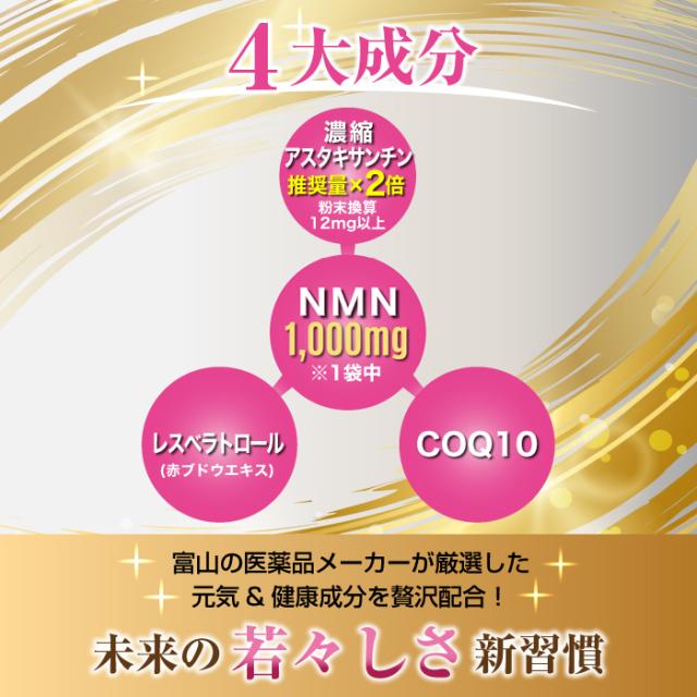 ・注目されている NMN ( ニコチンアミドモノヌクレオチド ) 1,000mg、濃縮アスタキサンチン、レスベラトロール(赤ワインポリフェノール)、COQ10(コエンザイムQ10)の融合。
