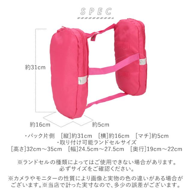 | サイズ | ・バック片側 [縦]約31cm/[横]約16cm/[マチ]約5cm ・取り付け可能ランドセルサイズ [高さ]32cm〜35cm/[幅]24.5cm〜27.5cm [奥行]19cm〜22cm ※ランドセルの種類によってはご使用できない場合があります。必ずサイズをご確認ください。 ※サイズは当店平置き実寸サイズです。実際の商品とは多少の誤差が生じる場合がございます。あらかじめご了承ください。 |