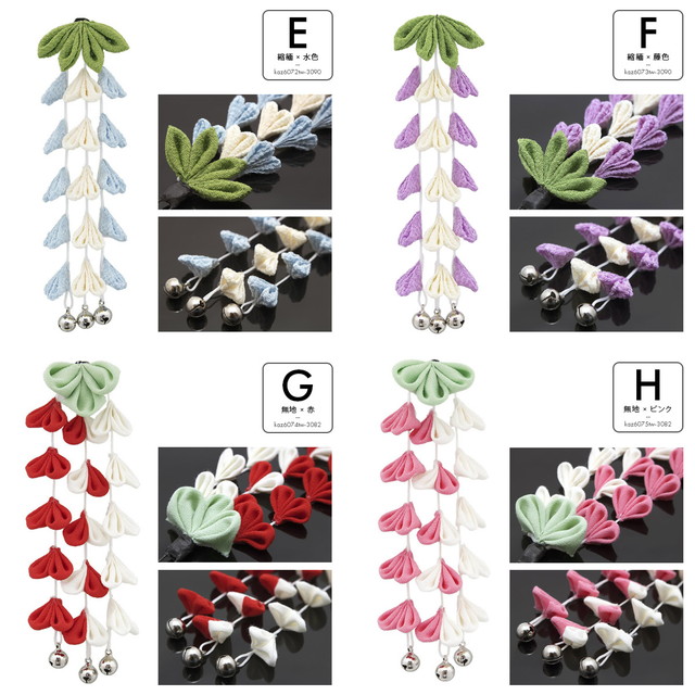 伝統手芸のつまみ細工で仕上げられた、鈴のついた縮緬地の藤下がりです。