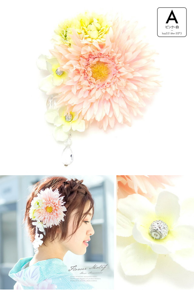 髪飾り 和装 花 浴衣 夏 ガーベラ フラワー ぶら飾り 緑 白 ピンク 紫 クリップ コサージュ ショートヘア 送料無料