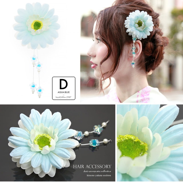髪飾り 和装 花 浴衣 夏 ガーベラ フラワー ぶら飾り 白 ピンク 紫 黄色 青 緑 クリップ コサージュ ショートヘア