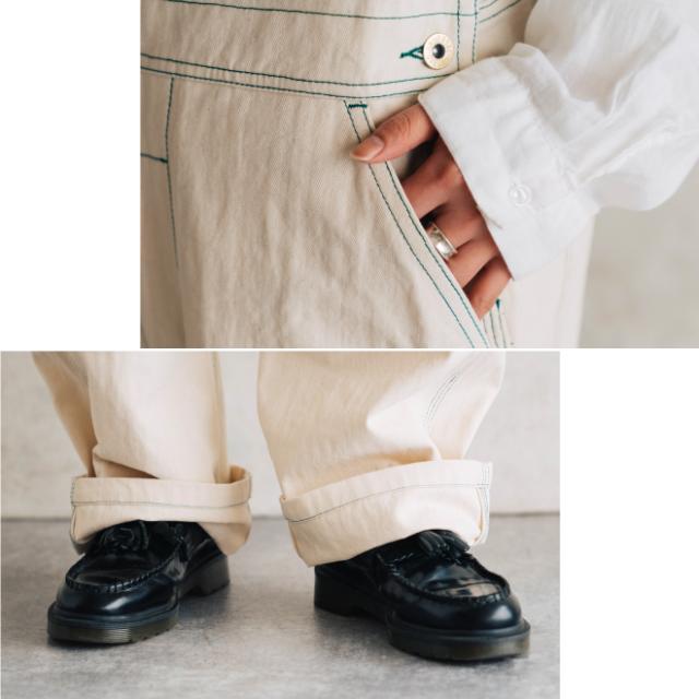大きめポケットやサイドのハンマーループなど、ワークウェアの特徴を残しつつ街で着こなせるスタイリッシュなデザイン。ホワイト色にはアクセントとなるカラーステッチが施されています。