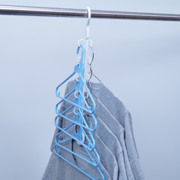 収納時に縦にして使えば反対側の穴も使え、リレーハンガー1本で計10本のハンガーが掛けられます。