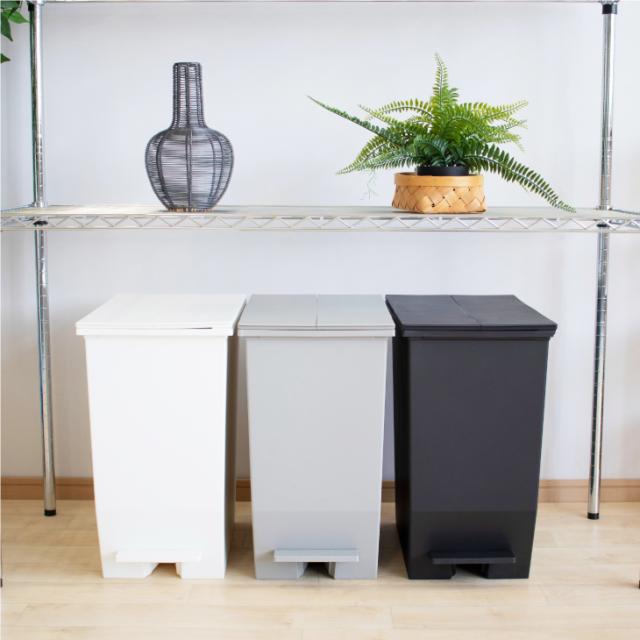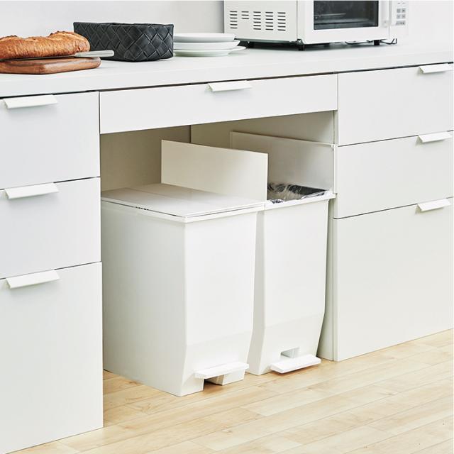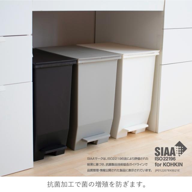 抗菌加工+手を使わず開閉できるペダル式でキッチンでの使用も衛生的に使用できて左右両開きのフタは棚下に置いたままごみが捨てられます。