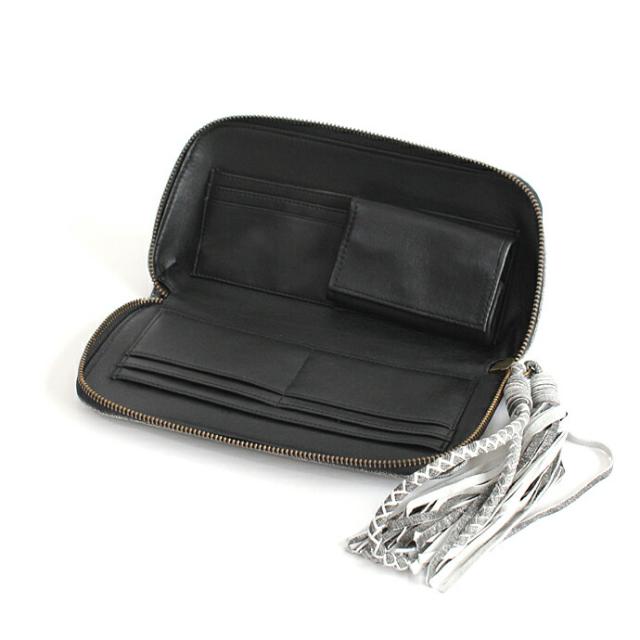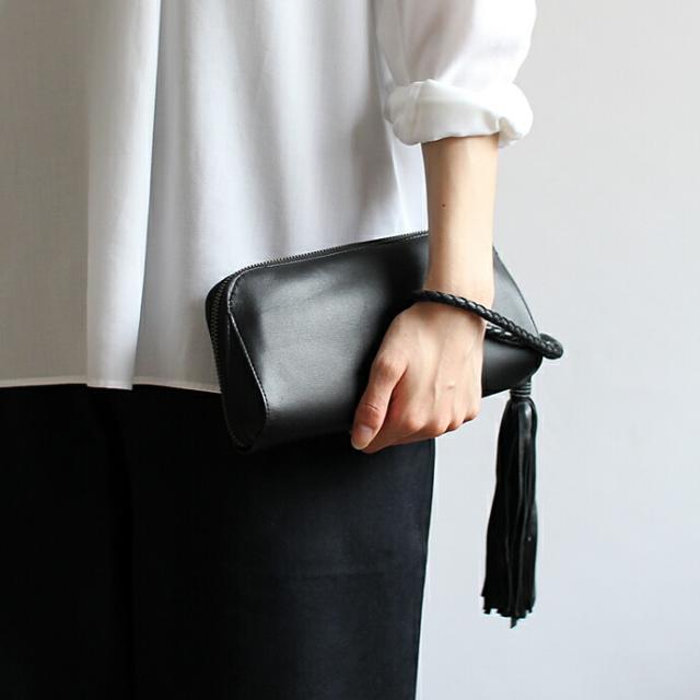 長財布とクラッチの間のようなデザインで、手首にかけられるストラップと大きめのタッセルがポイント。