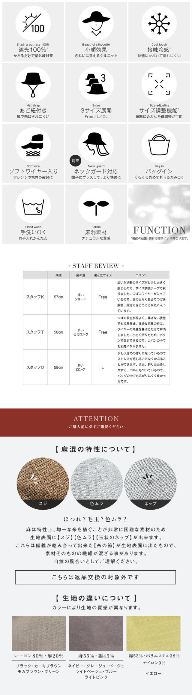 | 【ブラック・カーキブラウン・グリーン・モカブラウン】レーヨン80%、麻20% 【ベージュ・ブルー・グレージュ・ライトベージュ・ライトピンク・ネイビー】麻55%、綿45% 【イエロー】綿53%、ポリエステル38%、ナイロン9% 【接触冷感素材(裏地)】ナイロン95%、ポリウレタン5% 【遮光芯】ポリエステル100% |