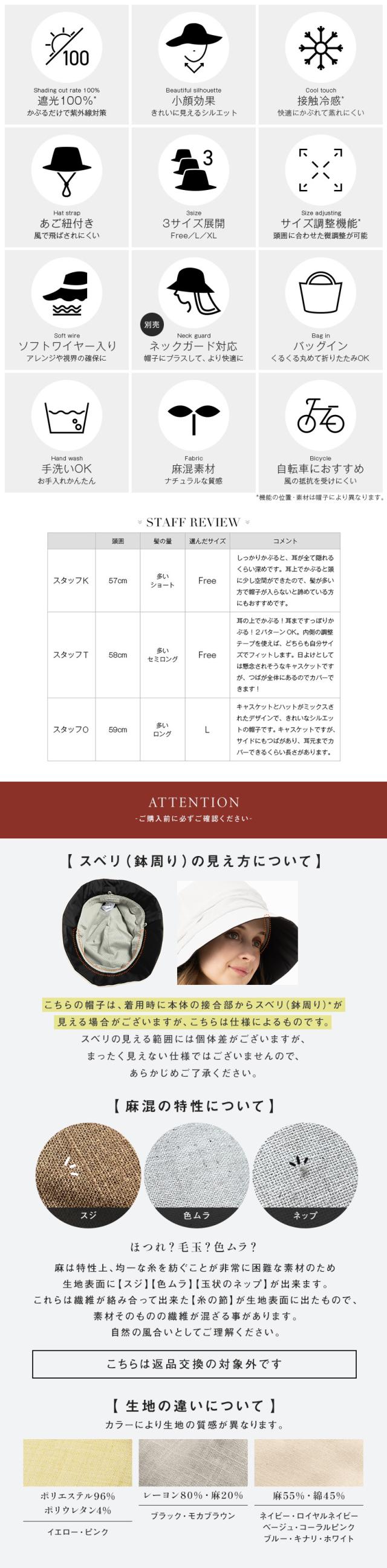 | 【イエロー・ピンク】ポリエステル96%、ポリウレタン4% 【ブラック・モカブラウン】レーヨン80%、麻20% 【ベージュ・ネイビー・キナリ・ホワイト・コーラルピンク・ロイヤルネイビー・ブルー】麻55%、綿45% 【接触冷感素材(裏地)】ナイロン95%、ポリウレタン5% 【遮光芯】ポリエステル100% |