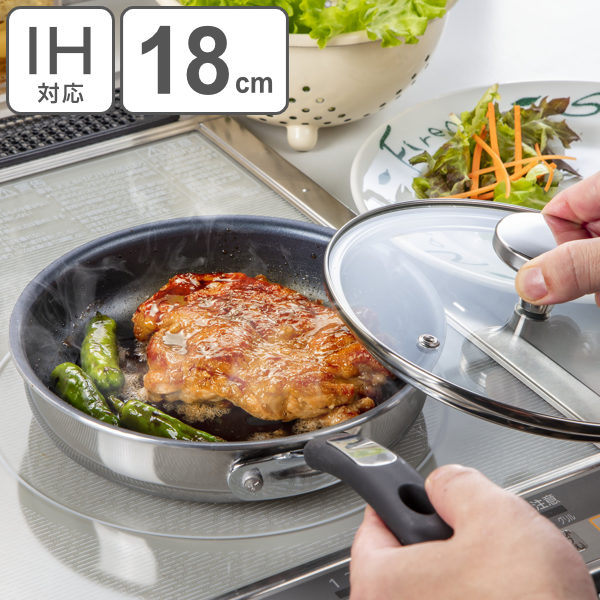 フライパン 18cm IH対応 ガラス蓋付き ストリール ステンレス アルミ フッ素加工 ( ガス火対応 炒め鍋 浅型フライパン いため鍋 アルミニウム 2層構造 18センチ アルミフライパン 鍋 フランジ加工 フッ素樹脂加工 オール熱源対応 フライパン ih対応)