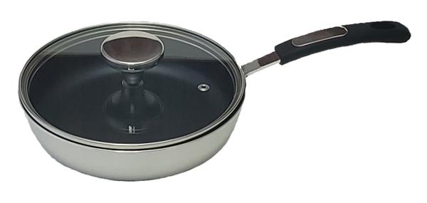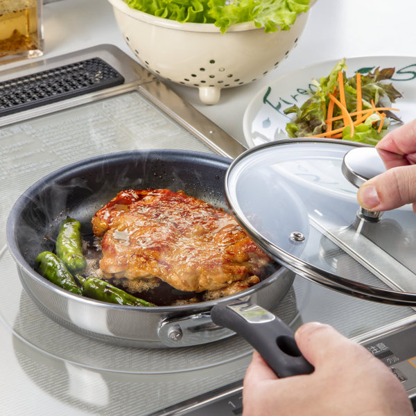 ガラス蓋付きの小ぶりなフライパンです。ステンレスとアルミニウムの2層構造で保温性があるので調理がふっくらと仕上がります。焦げ付きにくく耐久性にも優れています。ガス火はもちろん、IHも対応しています。付属のガラス蓋は中身を確認しながらの調理に適しているので、蒸し料理など幅広く活躍します。