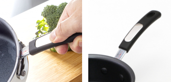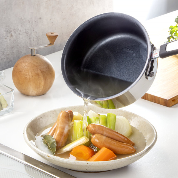 本体はステンレスの保温性とアルミニウムの熱伝導性を合わせた2層構造です。金属ヘラの使用可能です。熱伝導が良いので細かい火力調整がしやすいです。内面はポリゴコアコートフッ素樹脂により、お手入れがラクにできます。