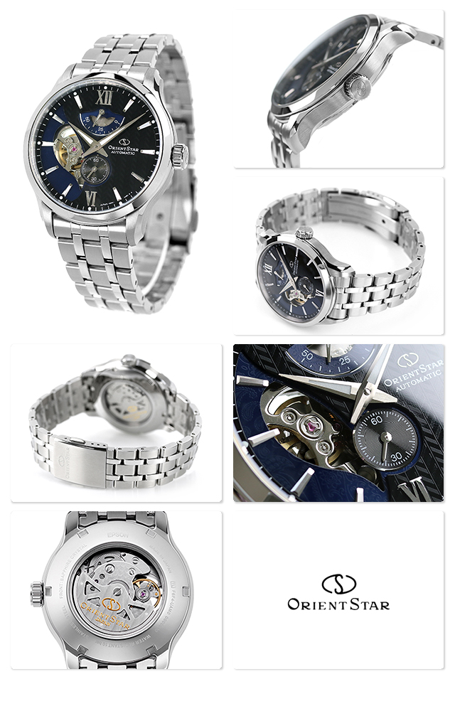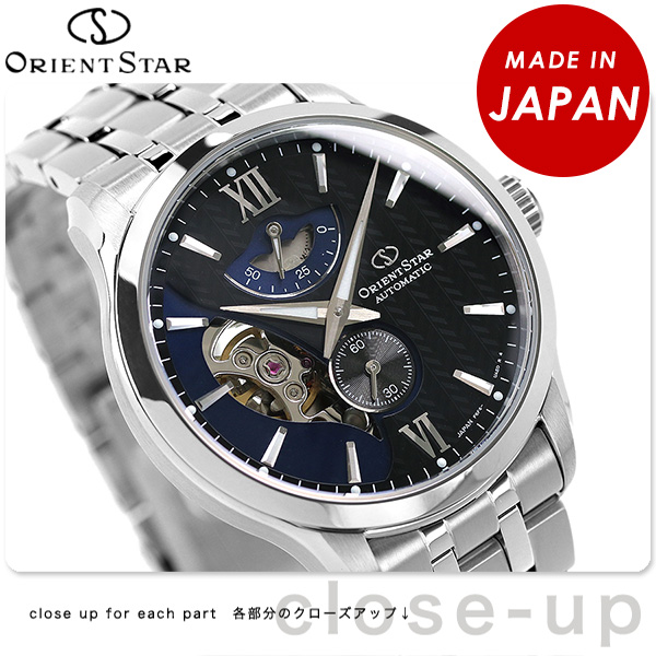正規品 7年保証キャンペーン 送料無料 オリエントスター コンテンポラリーコレクション レイヤードスケルトン 日本製 自動巻き メンズ 腕時計 RK-AV0B03B ORIENT STAR CONTEMPORARY Layered Skeleton アナログ ブラック ◆男性のこだわりを演出する色気あるビジネススーツスタイルをモチーフに、動きのある重なり(レイヤード)やテキスタイルの表情を落とし込んでデザイン。二枚文字盤によるレイヤー構造はスーツの表裏の表情の違いや重ね着による動きを表現しています。上の文字盤には、シャツやスーツの生地で使われているヘリンボーン柄印刷を採用。左右の綾でツヤあり・ツヤなしを分けることにより、織生地のように光の当たり方で表情が変化します。放射目を施した下文字盤には、うっすらと見えるペイズリー柄印刷を採用。特徴的なセミスケルトンの形状もペイズリーをモチーフにデザインしています。ケース形状は独特のくびれのあるデザインに仕上げ、スーツスタイルが醸し出す色気のあるドレープ感を表現しています。 発売日:21年3月発売 機械式腕時計 Made in Japan