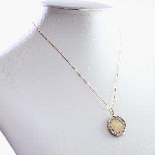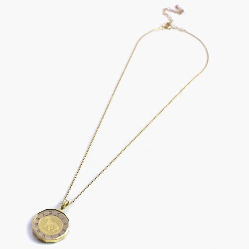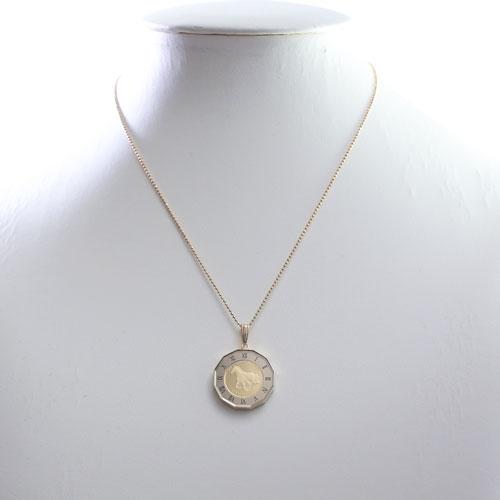 パンプ社発行の純金メダルで、爪のない両面使える18金フセコミ枠を巻き、イタリア製のシルバーカットボールチェーンをセットしたペンダント。【素材】 ●コイン(24金 1/25オンス約1.2g)枠(18金、両面強化ガラス付)、チェーン(シルバー925ゴールド仕上げ) 【チェーン】 イタリア製カットボールチェーン●長さ約42cm●留具は引輪式 【トップの大きさ 】●枠込直径約20mm(バチカン込約30mm)●枠込の厚さ約3.5mm 【総重量】 約5.1g(トップ部分) 【デザイン】 片面:馬、片面:馬蹄