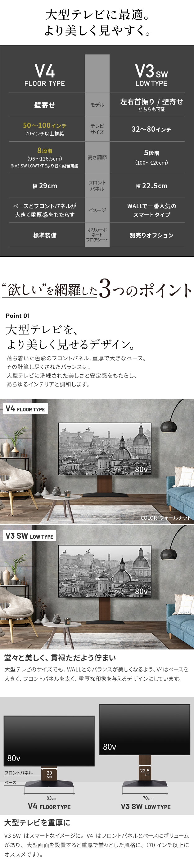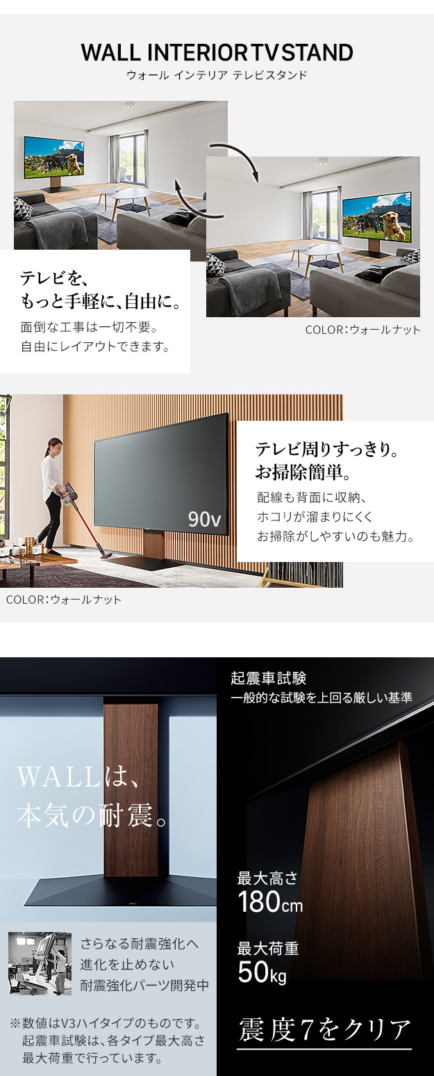 【震度7耐震試験済み/50〜100インチ対応】WALL(ウォール) インテリアテレビスタンドV4 フロアタイプ 3色対応 高さ調節機能 テレビ 工事不要 テレビスタンド 壁寄せタイプ リビング ディスプレイ グッドデザイン賞受賞