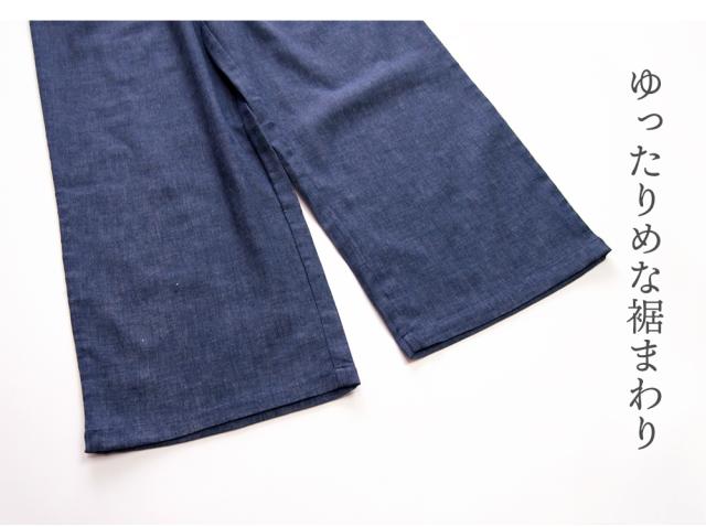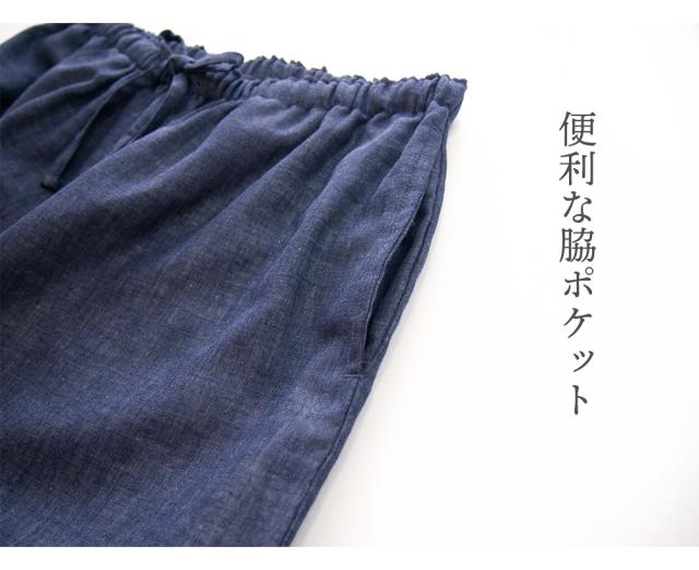 ウエストや裾幅を少しゆったりめに作り、両脇にはポケットがあり便利です。