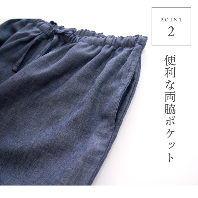 ウエストや裾幅を少しゆったりめに作り、両脇にはポケットがあり便利です。
